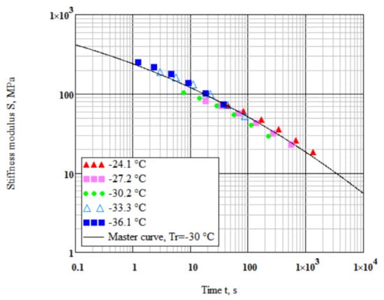 Master curve of stiffness as a function of time for the Elvaloy modified bitumen binder at = −30 °C.