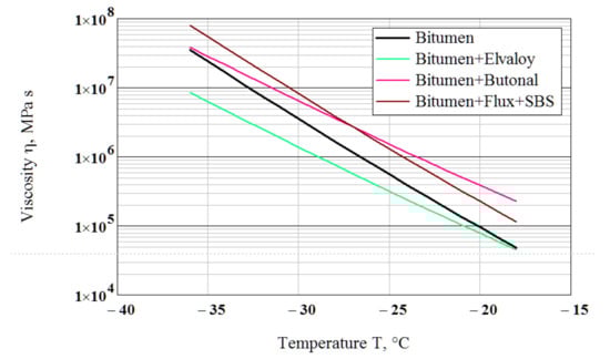 The slopes of the viscosity-temperature relationships to the temperature axis for the binders modified by the polymers Elvaloy and Butanol are almost equal and they are smaller than the slopes for the neat bitumen and the bitumen compounded by the flux and modified by the polymer SBS. This indicates the lower temperature susceptibility of the Elvaloy and Butanol-modified binders. In the range of the testing temperatures, the Elvaloy-modified binder has the smallest viscosity while the Butanol-modified binder (at temperatures higher than −27 °C) and the flux compounded and SBS-modified −27 °C) have the greatest one. The ability to estimate the viscosity of a binder at subzero temperatures indirectly from conventional BBR testing is a useful feature of the paper.
