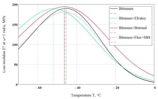 Loss modulus was calculated from Equation (20) using Equation (19) and the parameters are shown in Table 2 at the frequency = 1 rad/s. When the loss modulus is plotted versus temperature, the resulting curve exhibits a peak value (Figure 8). The temperature at this peak value can be interpreted as a glass transition temperature The temperatures at which the calculated reached a maximum value were = −45.4 °C for the neat bitumen, = −52 °C for the Elvaloy-modified binder, = −46.3 °C for the Butanol-modified binder and = −46.2 °C for the flux-compounded and SBS-modified binder. Changing the “testing” frequency by a factor of 10 results in a shift of 5.5–7 °C.