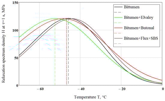 The ability to estimate the glass transition temperature in terms of relaxation time spectrum is important for understanding the behavior of binders at low temperatures. The molecular mobility of liquids including bitumen binders expresses itself in a relaxation–time spectrum. The broader the molecular weight distribution is the broader the relaxation spectrum becomes [,]. When a liquid-cooled down, its volume reduces due to the translational molecular readjustments rather than due to their oscillating motions. When a temperature reaches the glass transition region, the speed of molecular adjustment becomes slower and no further change in order can be observed over a given time scale. Physically, the glass transition occurs at the temperature when the root-mean-squared displacement of the particle of average molecular weight becomes smaller than the average size of that particle [], on a given relaxation timescale (of the order of = 1 s, for example). Relaxation at a temperature lower than occurs mostly due to the oscillating motion of molecules. Thus, the glass transition is the transformation of a disordered state with molecular mobility to an immobilized state of a similar structure by means of decreasing temperature. The transformation of liquid (e.g., a bitumen binder) is caused by a continuous increase in the modal relaxation time up to the given scaling time. It can be the time scale of practical observation or an experiment. Relating the bitumen binder properties or performance to the particular scaling time value requires more research.