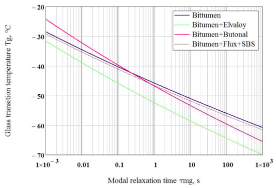 For the fixed = 1 s, using the parameters shown in Table 2, the calculated from Equation (28) glass transition temperature equals = −45.8 °C for bitumen, = −52.4 °C for the Elvaloy-modified binder and = −46.7 °C for the Butanol-modified binder, which almost coincides with determined from the peak of loss modulus at frequency = 1 rad/s (Figure 8). The calculated dependence of glass transition temperature on modal relaxation time is presented for the tested binders in Figure 10.