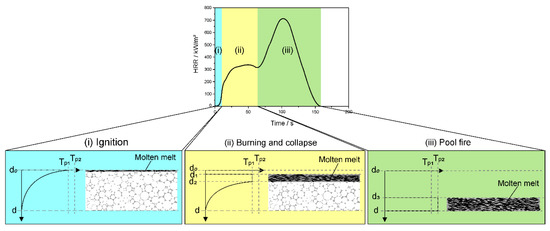 In terms of burning behavior, FPUFs can be ignited more easily than RPUFs, and fire propagates more quickly because of their lower density and open-cell structure [48,49], while RPUFs have a higher density and a closed-cell structure [26]. The curves of the heat release rate (HRR) of FPUFs from cone calorimeter measurements are displayed in Figure 2. For FPUFs, the curve exhibits three stages. In the first step (i), the surface of the foam is heated up; then, decomposition is initiated, and the foam ignites. According to the two-step decomposition of polyurethane, mainly, urethane bonds decompose, and the volatile pyrolysis products of the hard segments feed the flame. After this ignition stage (i), in stage (ii), the foam is covered by a molten layer of pyrolyzing polyurethane, such that the foam burns, collapses, and forms a pool of intermediate liquid pyrolysis products. After the first peak or plateau-like burning in stage (ii), the heat release rate surges to another, higher peak in stage (iii), because the remaining material burns in a violent pool fire [48,50,51]. The differences between the different burning stages can be described by the temperature–thickness relationship. Figure 2 and Figure 3 show the temperature–thickness relationship of FPUFs and RPUFs during different stages of burning, respectively. At the beginning of burning, individual cell walls or struts behave as thermally thin materials, such as a film or fiber. After ignition in stage (i), the very top layer of FPUFs at d0 is consumed under the influence of thermal radiation, forming a thin pyrolysis zone at the first pyrolysis temperature (Tp1). The yielded liquid pyrolysis products mainly belong to the soft segments, and the volatiles released mainly belong to the hard segments. The excellent thermal insulation of the foam results in a rapid decrease in temperature across the intact foam, as the entire unmolten part is thermally thick. As heating continues, stage (ii) is reached, with the next few layers from the top of the FPUF also collapsing and melting, forming a thicker pyrolysis zone. Due to the good convection of the molten melt from d1 to d2, the melt is considered to reach the same pyrolysis temperature at Tp1. As the remaining unburned material is still thermally thick, its temperature decreases inversely toward the bottom of the material. The cellular structure melts and collapses in stage (ii), resulting in a pool fire (iii), generally at the second pyrolysis temperature (Tp2) from d3 to d. The high fluidity of the melt under high temperatures exhibits a constant temperature due to convection. Almost no heat flux is attributed to further heating in stage (iii), but the heat flux is completely transferred to pronounced pyrolysis.