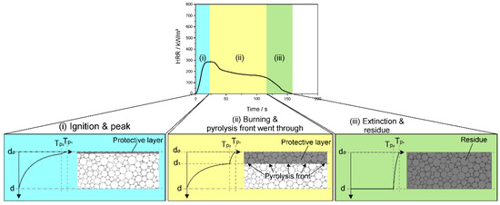 RPUFs behave quite differently from FPUFs during burning, showing the typical HRR curve for residue-forming materials in Figure 3 [9,26,27]. After ignition in stage (i), they reach the PHRR immediately, undergoing distinct charring at Tp1, with no structural collapse and no formation of a pool fire because of their higher crosslink density. The char on the top acts as a protective layer, shielding the material underneath. The PHRR is subsequently followed by steady burning in stage (ii) at a lower HRR. The pyrolysis front at Tp2 continuously consumes the material downward from the top (d0) to d1. Due to the effective protective layer formed, the temperature of the unburned material from d1 to d decreases inversely toward the bottom of the material. The length of the steady-burning phase in the HRR curve depends on the amount of combustible material [26]. Therefore, less heat is released by RPUFs as the char yield increases [9,27]. In stage (iii), the pyrolysis front at Tp2 moves to the bottom of the material, and the flame is finally extinguished.