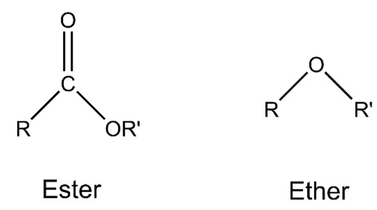 Polyester polyols and polyether polyols are the two main types of polyols. The difference in chemical structure between ester and ether is shown in Figure 5. Polyether polyols have more resistance to hydrolysis but are less stable to oxidation; the inverse is true for polyester polyols. Polyurethane foams based on polyether polyols have a lower decomposition temperature in air than those based on polyester polyols. To improve the fire behavior of PUFs, flame-retardant polyols such as VORAGUARD TM Polyol from The Dow Chemical Company (Midland, MI, USA) and Exolit® OP 560 from Clariant AG (Muttenz, Switzerland) are used. Another way to enhance the flame retardancy of PUFs is to use aromatic polyols to promote char yield during burning [53].