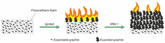 Natural graphite inherently has a layered structure. Intercalation is an important process to turn natural graphite flakes into EG. Therefore, EG is usually prepared by inserting oxidants, such as sulfuric acid, nitric acid, phosphoric acid, and acetic acid, between the layers of graphite [66]. The acid decomposes into gases, causing the graphite layers to be forced apart, thereby expanding graphite during heating. It mainly acts in the condensed phase by enhancing the char yield [63,65]. The burning behavior of PUFs with EG is illustrated in Figure 6. EG expands in size by several hundred times, developing a loose, porous “worm-like” structure to form a low-density thermal insulation layer, thereby protecting the underlying material from the heat source and slowing down pyrolysis by decreasing the release of volatile compounds. A minor factor in reducing flammability is that EG releases incombustible gases, such as CO2, SO2, and H2O, which helps to dilute the combustible gases surrounding the flame [38,66]. As the temperature rises, the sulfuric acid reacts with graphite, which leads to the oxidation of graphite to form CO2, water, and SO2, thus increasing the volume of EG to provide flame retardancy to the materials.