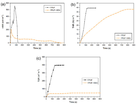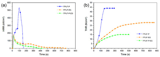 The burning processes of FPUFs and FPUFs with 10 wt.% EG (FPUF-10EG) are described by the heat release rate (HRR) and total heat release (THR) curves in Figure 8a,b, respectively, via cone calorimeter measurement. With 10 wt.% EG, the HRR is greatly reduced, and the sharp peak appears at the beginning of burning [42,68]. The very top surface of the polymer matrix is exposed to the heat flux, initially without any protection, so that the HRR reaches the highest value within a very short time. Since the FPUF with 10 wt.% EG in the pyrolysis front region is continuously subjected to the pyrolysis temperature, the polymer matrix starts to decompose. After accumulating a certain amount of expanded graphite at the pyrolysis front, it acts as a protective layer for the underlying material. The HRR keeps gradually decreasing, and the burning time is prolonged. The presence of 10 wt.% EG results in a lower PHRR and a flatter HRR curve. Only minor second and third peaks following the PHRR are shown in the HRR curve of FPUF-10EG, which proves that a sufficient amount of EG significantly reduces the fire hazard.