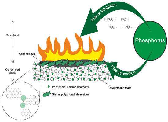 Figure 9 shows the modes of action of phosphorous flame retardants [56]. Phosphorus usually works in the gas phase and the condensed phase [79,80,81]. The free phosphorous radicals, such as HPO2·, HPO·, PO·, and PO2·, generated in the gas phase can quench the other free radicals formed, such as H· and OH·, by slowing down or interrupting the branching and chain reactions of the oxidation of hydrocarbons during burning, thus playing a role in flame inhibition [82,83]. Phosphorous radicals lead to less complete combustion in the flame zone, thereby reducing combustion efficiency (χ). As a result, increased amounts of incomplete combustion products such as smoke and carbon monoxide evolve at the same time [2,32]. Meanwhile, the heat release is reduced because phosphorus prevents the conversion from carbon monoxide to carbon dioxide, which is a highly exothermic reaction. In the condensed phase, phosphorus takes a variety of modes of action. The dehydration reaction of the polymeric structure during burning induces aromatization and graphitization, and phosphorus acts as a crosslinker to enhance charring. Bourbigot et al. [84] demonstrated that polyaromatic species are crosslinked with phosphohydrocarbonaceous bridges to form voluminous carbonaceous char with higher thermal stability. Phosphorus generally pyrolyzes under elevated temperatures, forming phosphoric acid derivates to catalyze the carbonization of polymers. However, some phosphoric acid, instead of interacting with the charring agent, generates inorganic polyphosphate glass that acts as a barrier to reduce mass transfer and heat release [85,86,87]. Although phosphorous compounds are char promoters, incomplete charring by phosphorus, such as aromatization without graphitization, can increase smoke release and even produce larger decomposition fragments. Phosphorous compounds are used as additive or reactive flame retardants in polyurethane foams. For the former, the flame retardancy of the material may decrease over time due to the migration of the flame retardant. Moreover, flame-retardant additives are usually detrimental to the mechanical properties of polymers. Conversely, reactive phosphorous flame retardants are chemically bonded to the main polymer chain or grafted to the backbone as branches. Therefore, using reactive flame retardants is a solution to prevent migration, providing even distribution on the polyurethane backbone and maintaining mechanical performance.