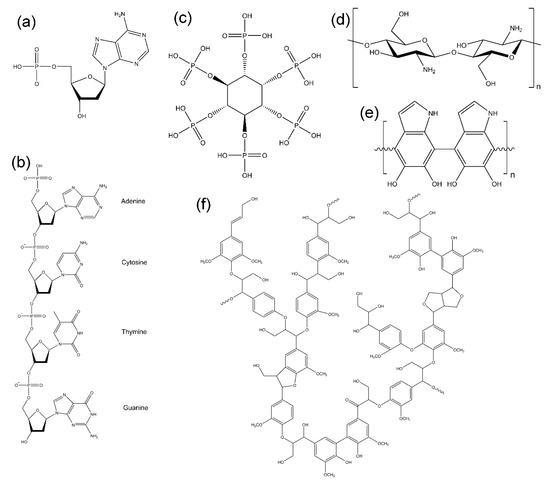 Natural flame-retardant additives: (a) deoxyribonucleic acid (DNA), (b) chain of DNA, (c) phytic acid, (d) chitosan, (e) polydopamine, and (f) lignin.