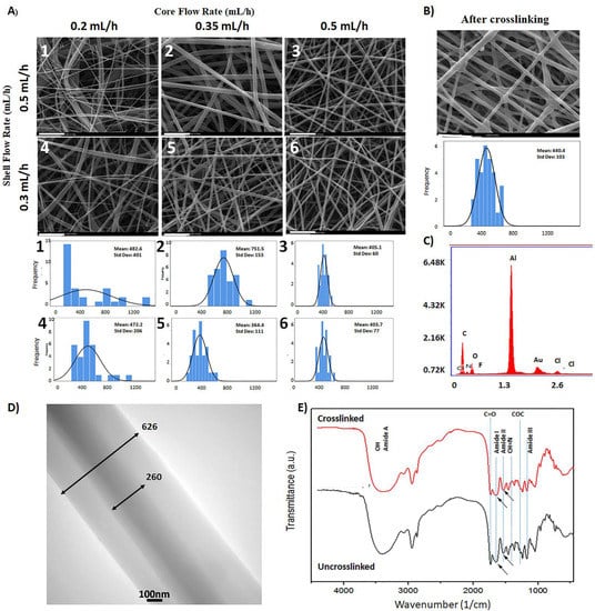 The morphological and chemical study; (A) the SEM micrographs (scale bar = 5 μm), and the fiber diameter distribution of the prepared samples at different flow rates of the core and shell solutions; (B) the SEM micrograph (scale bar = 5 μm) and fiber diameter distribution of the optimized scaffold after crosslinking; (C) the EDX spectrum of the prepared scaffold; (D) the TEM image of the prepared core–shell nanofiber; (E) the FTIR of the prepared scaffolds before and after crosslinking.