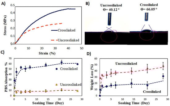 The mechanical and physical characterizations; (A) the tensile stress–strain curve; (B) the images of the water contact angle test; (C) the PBS absorption (%); (D) the weight loss (%) of the coaxial scaffolds before and after crosslinking.