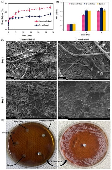 The initial loading of the ciprofloxacin in the shell solution was 15% (w/w, drug/polymer). The drug concentration released from the scaffold before and after crosslinking was measured using a UV-Vis spectrophotometer in the range of 200–800 nm. Maximum absorption of ciprofloxacin was measured at 323 nm. The standard calibration curve was drawn in the range of 13.64 to 30 μg ciprofloxacin/mL PBS. The calibration equation was calculated as y = 28.86x − 2.05, R2 = 0.9964. The linearity of the standard calibration curve and its correlation coefficient confirms the Beyer–Lambert law. Figure 3A shows the cumulative drug release (%) from the scaffold before and after crosslinking over 28 days. Both samples showed an initial rapid release and a lower release rate similar to the degradation results. Therefore, the rapid initial release can be attributed to the initial dissolution and degradation of gelatin in the shell. The rate of drug release in the uncrosslinked sample is slightly higher than that in the crosslinked one, confirming the faster degradation of the uncrosslinked sample. According to the results, about 50, and 70% of the loaded ciprofloxacin in the shell structure was released over 28 days from the crosslinked, and the uncrosslinked scaffold, respectively. Therefore, crosslinking was effective in controlling the drug release, and decreasing the release rate of the drug from the scaffold [].