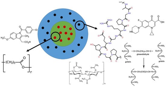 This study aimed to prepare and characterize the core–shell nanofibers of gelatin/cellulose acetate and poly(ε-caprolactone) using the coaxial electrospinning method. Poly (ε-caprolactone) was used to reduce the drug release rate due to its low degradation rate [,,]. Additionally, to improve the surface hydrophilicity of the scaffold, natural polymers of gelatin and cellulose acetate were used as the outer layer (shell) of the fibers to create proper signaling and interaction between the scaffold and the cell []. The indomethacin and ciprofloxacin as model drugs were added to the core and the shell solutions, respectively. The scaffold morphology and properties were studied. Additionally, the effects of the drugs’ presence and crosslinking of the shell components on the physical properties, drug release behavior, biocompatibility, and antibacterial activity of the scaffold were evaluated.