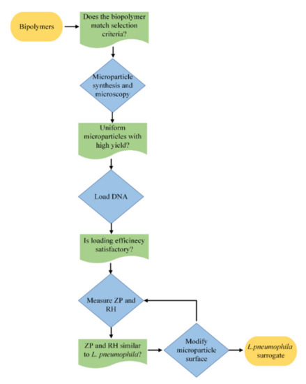 Figure 1) was used, which included: (1) selection of biopolymer materials; (2) microparticle synthesis; (3) microparticle visualization, DNA loading, and characterization; (4) microparticle surface modification. Biopolymers were assessed in each stage to answer a “critical yes/no question” (represented in green,