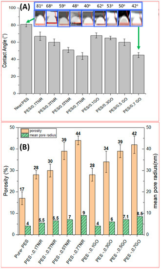Figure 1B shows that increasing the ratio of nanomaterial increases the porosity of the membranes. The microstructure of generated membranes is influenced by the thermodynamic and kinetic components of the phase inversion process. Nanomaterial was used to increase porosity. The thermodynamic effect of adding nanomaterial resulted in uniform dispersion and the hydrophilic character of the added nanomaterial increased hydrophilicity and accelerated non-solvent adsorption, increasing the polymer film’s thermodynamic instability. During the phase inversion process, quick demixing resulted in the production of membranes with a larger porosity. During non-solvent induced phase separation (NIPS), the high affinity of the solvent to cover embedded nanomaterial compared to polymer chains results in the creation of membranes with a larger porosity [44]. The membrane pore size is affected by the phase transition velocity of water–solvent during phase inversion. The mean pore size is estimated using Equation (2) and presented in Figure 1B for all studied membranes. The mean pore size of PES-GO and PES-TNR membranes increased as the amount of GO and TNR added increased, as shown in Figure 2B, which is due to the hydrophilicity properties of GO and TNR, which is compatible with the contact angle and porosity results. This is also consistent with the findings of Nurul et al. [45], who found that additive loadings increased the hydrophilicity and surface porosity of membranes. The PES-GO and PES-TNR membranes developed in this work had a reduced contact angle, higher porosity, and larger mean pore size, which resulted in superior hydrophilic characteristics.