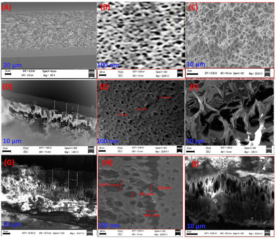 Cross-sectional SEM micrographs for (A–C) pure PES, (D–F) PES-0.7GO, and (G–I) PES-0.7TNR membranes.