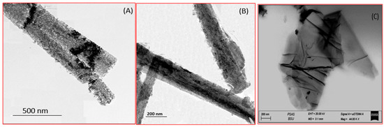 Transmission electron microscopy (TEM) has long been recognized as a helpful method for describing the morphology of GO and TNR. TEM images, Figure 3A,B, of the calcinated TNR illustrate the influence of the calcination temperature on the surface of the produced nanoribbons. The conversion of hydrogen titanate to TiO2-B NRs resulted in the formation of pores with diameters ranging from 2 to 10 nm [49]. These pores are formed because the interlayered OH groups escape the structure [50,51]. Figure 3C illustrates the graphene oxide plates as flat surfaces. The effective synthesizing of the GO nanostructure is confirmed by the TEM image in Figure 3C. By oxidizing graphene extensively, the graphitic stack’s flakes were chemically exfoliated into mono- and multilayer sheets [52,53].