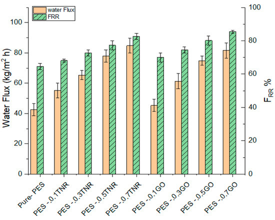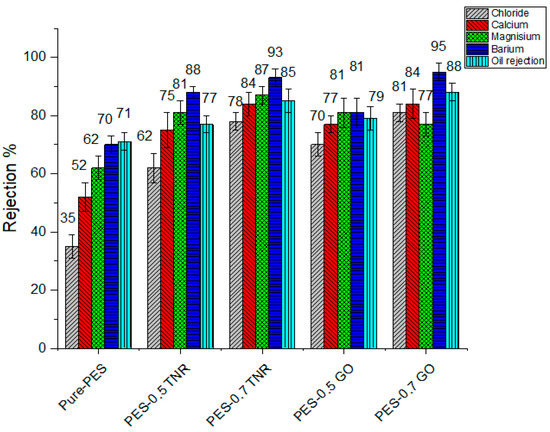 Water flux of the synthesized membrane was evaluated by observing the permeate volume per unit time at a discharge pressure of 0.3 MPa. Figure 6 demonstrates that the PES-0.7GO membrane had a higher water flux than the PES-0.7TNR membrane, while the pure-PES membrane had the lowest water flux. This is owing to the PES-0.7GO membrane’s higher hydrophilicity than the PES-0.7TNR membrane, while pure PES has the lowest hydrophilicity [40,64]. The ability of water molecules to permeate across the selective layer of the membrane is increased by increasing the hydrophilicity. It might also be attributed to the inclusion of nanostructures, which results in the creation of macro voids and an increase in porosity and mean pore radius. The increase in porosity and mean pore radius after introducing nanomaterial is consistent with the results of water flux [65]. The findings of employing GO as a nanofiller material for nanofiltration membranes are consistent with the reported data by Hao et al. [25] and Amin et al. [61]. TiO2 nanomaterial, which is utilized in nanofiltration, also improves the water flux [66,67,68].