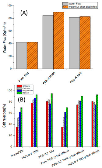 To evaluate the alkaline resistance of the membranes, PES-0.7 GO and PES-0.7 TNR membranes were immersed in 1 M NaOH for three days, and water flux and salt rejection were compared to previous results.
