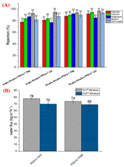 (A) Salt rejection% and (B) water flux using PES-0.7 TNR and PES-0.7 GO in a double filtration process.