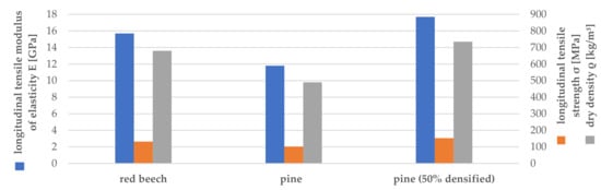 To exploit the material potential of softwood, its structural composition must be considered during processing. This includes, on the one hand, utilizing the excellent mechanical properties in the growth, respectively, longitudinal direction and, on the other hand, the specific compaction of the porous softwood structure while retaining the strength-giving components [10]. Figure 1 shows a comparison of the material properties of red beech and pine [11] as well as the hypothetical achievable properties of pine at 50% compression. It clearly shows that pine wood can at least match or even surpass the properties of beech wood through the targeted compaction.