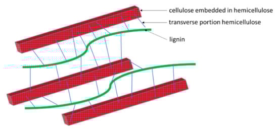 Schematic representation of the microstructure of lignocellulosic plant cell walls (hemicellulose—blue, cellulose—red, lignin—green) [43].