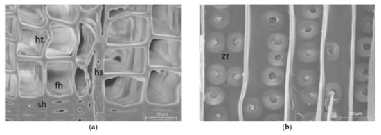 SEM images of softwood in cross-section (fh earlywood, sh latewood, ht bordered pits, hs ray) (a) and in radial section (zt twin bordered pits) (b) Reprinted with permission from Ref. [45]. 2012, Rosenthal.