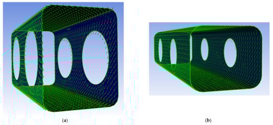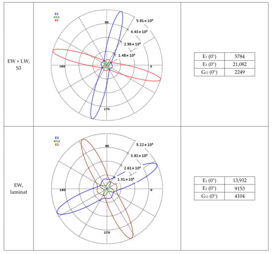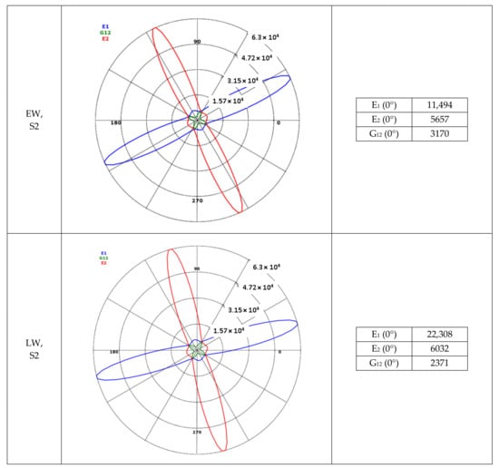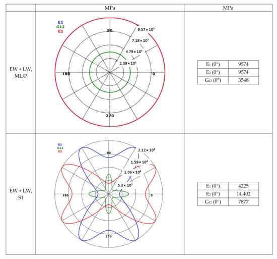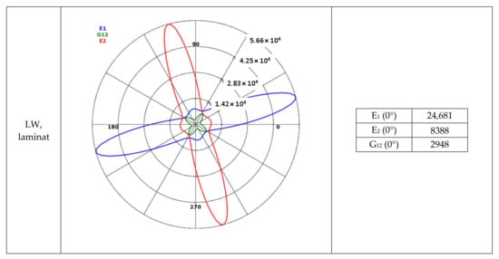 By combining the mechanical properties of the unidirectional cell wall single layers from Table 3 and the laminate structure from Table 4, the resulting mechanical properties of the individual cell wall single layers as well as the overall laminate structure were calculated, presented in polar diagram form (Figure 5) and used to replicate the cell wall in Software Ansys ACP PrePost, Version 2019 R1, ANSYS, Inc., Pennsylvania, US (Figure 6).