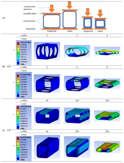 Therefore, it is necessary to simulate the tangential as well as the radial deformation behavior of the tracheids. Figure 8a shows the selected boundary conditions for the simulation using the FEM software Ansys Workbench Mechanical 2019 R1 (ANSYS, Inc., Canonsburg, PA, USA). The position of the lower side of the tracheid on the fixed plate was set by choosing the contact type “bonded” (separation in the surface normal direction and sliding in the surface tangential direction prohibited), and for the moving plate, the contact type “rough” (separation in the surface normal direction allowed but sliding in the surface tangential direction prohibited) was selected. The mesh settings were set to physics preset “mechanics”, element approach function “linear”, element size “0.003 mm”, adaptive size “no” and mesh defeaturing “yes”. Subsequently, the compression pressure on the movable plate was increased until the cell walls collapsed. Because the deformed and undeformed geometry differs significantly, the Ansys nonlinear adaptivity feature (NLAD) was activated to repair the mesh distortions that would trigger convergence issues. Figure 8b shows the deformation of an EW tracheid for radial as well as tangential compression at 23 °C and 12% moisture. In the radial direction, cell collapse starts at 2 MPa compression pressure and at 4 MPa, the tracheid is deformed by over 0.035 mm. In the tangential direction, cell collapse starts at 4 MPa compression pressure and at 8 MPa, the tracheid is deformed by over 0.023 mm. Figure 8c shows the deformation of an LW tracheid for radial as well as tangential compression at 23 °C and 12% moisture. In the radial direction, cell collapse starts at 110 MPa compression pressure and at 210 MPa, the tracheid is deformed by more than 0.013 mm. In the tangential direction, cell collapse starts at 120 MPa compression pressure and at 250 MPa, the tracheid is deformed by over 0.018 mm.