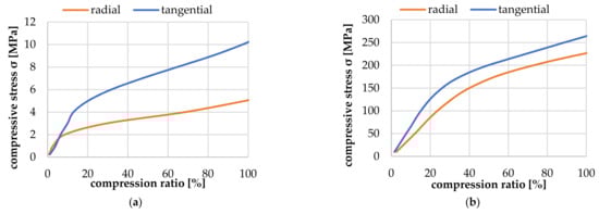 Figure 9 shows the resulting correlation between compression pressure and compression ratio (ratio of deformation to total height minus twice the wall thickness) on the left side for an EW tracheid in radial and tangential directions. The stress plateau in the tangential direction is about 200% higher than in the radial direction, and the plateau already starts at a 10% compression ratio. On the right side of Figure 9, the resulting correlation between compression pressure and compression ratio for an LW tracheid in the radial and tangential direction is depicted. The stress plateau in the tangential direction is about 15% higher than in the radial direction, and the plateau already starts at a 30% compression ratio.