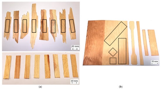 Furthermore, growth ring width, growth ring angle and the ratio of heartwood to sapwood vary considerably. This leads to a large deviation of the measurement results and makes it difficult to interpret the results and derive new knowledge to determine the optimum process parameters [49]. In order to avoid these measurement deviations, the tests were therefore carried out with veneer strips and squares, which show an even wood structure with parallel annual rings, allowing a defined separation between heart- and sapwood and samples, which can be cut out of the wood in a more defined manner (Figure 10b). For the mechanical tests, a 1 mm thick, lengthwise sliced pine veneer with an average density of 0.53 g/cm3 was purchased from Osenstätter GmbH Holz & Furnier, Schongau. The veneer is 16 cm wide with approx. 9 cm consisting of sapwood and approx. 7 cm of heartwood. It was exposed to laboratory climate at 23 °C and room humidity at 45% (measured with Trotec, BC06 hand-held measuring device) until a constant weight was reached before testing. The resulting water mass fraction was 8.3% for sapwood and 7.5% for heartwood (measured with Satorius, MA100 at 103 °C for 60 min.). To minimize the deviation of the measurement results, the samples were taken exclusively from the sapwood using a special glass fiber fabric scissor (R&G ERGO-STL).