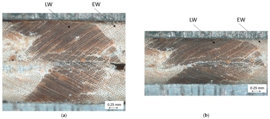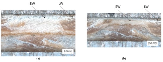 A representative length of 0.1 mm was selected and according to Qu et al., the membrane diameter of the bordered pits was estimated at about 70% of the radial lumen height (Figure 4) [48]. Because both types of tracheids show bordered pits in the tangential cell walls (LW less than EW), it is to be expected that their radial compressive strength will be lower than their tangential compressive strength.