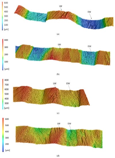 Figure 16 shows sections of the surface profiles of two wood particles that were compacted with 10 MPa for 10 min. at 23 °C. As presumed above, the degree of compaction of the EW areas decreases with increasing angle differences. The measured indentation depth of the LW areas at 0° was about 0.49 mm (Figure 16a), at 5° about 0.44 mm (Figure 16b), at 10° about 0.28 mm (Figure 16c) and at 15° about 0.26 mm (Figure 16d).