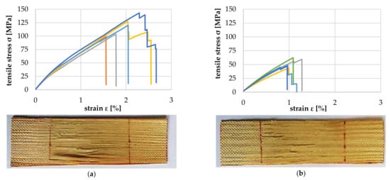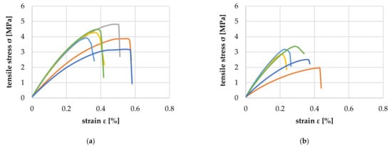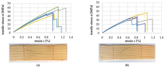 Figure 17 shows the comparison of the tensile properties of the above-mentioned veneer strips with 1 mm and 2 mm growth ring width (GRW). As expected, due to the higher proportion of LW, the tensile strength of the veneer with 1 mm GRW was twice as high as that of the veneer with 2 mm. Additionally, the elongation at the break of the veneer with 1 mm GRW was about 15% higher and in the range of approx. 1.6% (orange curve) to 2.3% (dark blue curve). The average longitudinal modulus of elasticity for GRW 1 mm was 8819.6 (+713.2/−629.2) MPa, and for GRW 2 mm, 5841.6 (+738.8/−886.8) MPa.