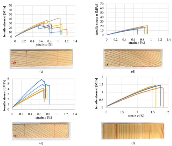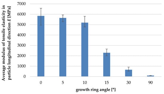Figure 18a–f show the tensile properties of the particles with the increasing deviation between annual ring angle and load direction. It is shown that from a deviation of 10°, there was a significant reduction in the tolerable tensile load and modulus of tensile elasticity (Figure 19). The failure mechanism changes from longitudinal tearing of LW tracheids, which can be seen in the stepped progressions of the stress–strain curves, to the formation of transverse cracks mainly in the EW areas, which can be seen in the abrupt drop in the stress–strain curve.
