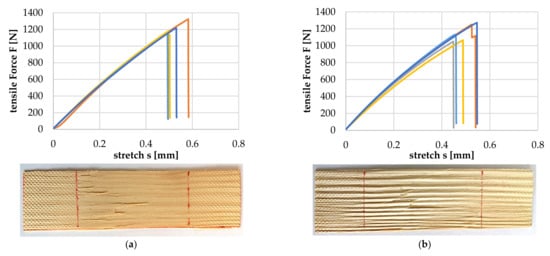 Tensile test at 0° deviation between particle and tracheid longitudinal axes tempered at 120 (a) and 170 °C (b) for 20 min.
