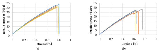 According to Hiller, no standardized method exists to determine the tensile properties of elongated wood particles [50]. Therefore, tensile tests based on DIN EN ISO 527-4 were conducted using at least five test specimens with a total length of 100 mm, a width of 25 mm and a thickness of 1 mm. The measuring length was 50 mm, and the testing speed was 1 mm/min. The tensile modulus of elasticity was calculated by determining the slope of the stress–strain curve between ε = 0.0005 and ε = 0.0025. This is permissible because most test standards for determining the modulus of elasticity of solid wood state that two value pairs out of the strain range before the proportionality limit are to be used.