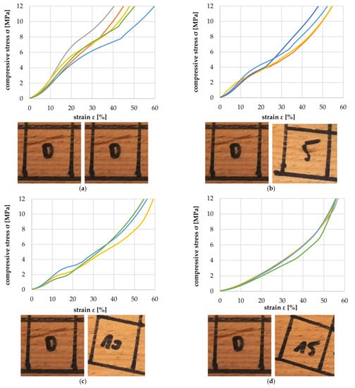 Figure 22a–d show the stress–strain curves for the compression of two layers (each 1 mm thick) of veneer squares (GRW 2 mm) perpendicular to their longitudinal axis with 0°, 5°, 10° and 15° angular differences in the longitudinal direction. For the 0°, 5° and 10° tests, a plateau in the stress–strain curves can be seen in the range of 10 to 30% strain. The area under the plateau indicates the work that is required to deform the EW tracheid areas (similar to the compression of foam materials and automotive crash absorbers).