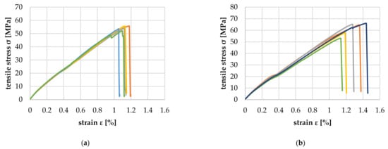 The measuring length was 120 mm, and the testing speed was 1 mm/min. The tensile modulus of elasticity was calculated by determining the slope of the stress–strain curve between ε = 0.0005 and ε = 0.0025.
