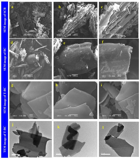 SCB was thermally treated to form biochar (BC) which was chemically treated with NaOH to compose treated biochar (T-BC). Scanning electron microscope was noted as an efficient device to fellow the surface morphology variation on the SCB before and after the treatment processes, as represented in Figure 1. The SCB powder seemed to have a long, wrinkle rod-like structure. Additionally, SCB showed a porous, fibrous texture, parallel stripes that constituted the fibers, waxes, extractives, and other deposits on the surface with rigid, compact, and thick-walled fiber cells inter-linked with pulp, as shown in Figure 1a–c. After thermal treatment of SCB to form BC, a smooth layered structure with flat surfaces and parallel sheaths was observed. Additionally, the observed flakes have some sheets, as illustrated in Figure 1d–f. This layered structure of BC became more smooth and was ordered after treatment with NaOH to form T-BC. The morphology of each layer became more obvious as the magnification was increased [34], as shown in Figure 1g–i. This ordered layered structure for the treated biochar was further confirmed with the transmission electron microscopy (TEM) technique and represented in Figure 1j–l. The presence of several thin and transparent sheets and a smooth surface was visible and indicated biochar nanosheets’ existence [35].