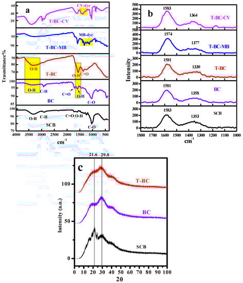 The vibration motion of distinct functional groups of the material surface is determined using FTIR. The resulted spectra of SCB, BC, T-BC, T-BC-MB, and T-BC-CV are shown in Figure 2a. For the SCB spectrum, the bands at 3327 cm−1 are due to O-H groups of surface adsorbed water. The two peaks at 2903 and 2349 cm−1 are attributed to symmetric and asymmetric vibrations of -CH and -CH2. The peak at 1722 cm−1 is due to the stretching vibration of C=O of unconjugated hemicellulose and lignin, respectively [36]. The -C=C- and -C=O stretching vibrations of the lignin aromatic ring are responsible for the band at 1599 cm−1 [11,37,38], while the band at 1507 cm−1 is attributed to lignin ring C=C skeletal vibration, the band at 1427 cm−1 belongs to lignin -CH2 and -CH3 bending, and the peak at 1319 cm−1 is due to cellulose -CH2 bending [11]. The aryl C–O out of plane stretching vibration of hemicellulose and lignin is responsible for the band at 1241 cm−1 [37,38]. The stretching vibrations of -C–O of hemicellulose and cellulose are observed at 1034 cm−1 [11,36]. The glycosidic bond β-(1–4) of cellulose has appeared at 831 cm−1 [39], and C-H stretching vibrations are represented by the two bands at 831 and 531 cm−1 [38,40]. Three peaks, 3871, 3797, and 3397 cm−1, are observed due to the presence of O–H stretching vibrations of the C–OH groups and water in the spectra of biochar [18,41]. After thermal treatment of SCB to form BC, the hydroxyl groups of SCB will be condensed into alkoxide groups, reducing the amount of the surface adsorbed. Further treatment of BC with NaOH to compose T-BC, the intensities of the bands related to the water motions at 3332 cm−1 and 1565 cm−1 will be enhanced, see Figure 2a. This may be attributed to the increased density of oxygenated function groups upon treating the BC with NaOH. This manner will cause T-BC to interact with the solvent from the surrounding environment, strengthening the band’s intensities at 3332 and 1565 cm−1. Furthermore, by mixing of T-BC with the dye molecules (MB and CV), the peaks related to the dye species will be observed in the FTIR- spectra. As a result, shifts, disappearance, the appearance of new bands, and changes in peaks were observed after the adsorption processes of dyes species. After MB adsorption, the peak at 3332 cm−1 shifted to 3257 cm−1, the peak at 1565 cm−1 shifted to 1589 cm−1, the peak at 1370 cm−1 shifted to 1383 cm−1, and the peak at 1238 cm−1 shifted to 1237 cm−1. After CV adsorption, the peak at 3332 cm−1 shifted to 3392 cm−1, the band at 1565 cm−1 shifted to 1630 cm−1, and the band at 1370 cm−1 shifted to 1380 cm−1. Additionally, after adsorption of MB and CV-dyes, new bands at 3480 and 3392 cm−1 were observed and attributed to the presence of MB and CV, respectively. In addition to ionic interactions between the -OH groups in T-BC-structure, MB and CV- species are assumed to be the cause of many abrupts decreases, with the band shifting possibly indicating that these functional groups interact with the MB and CV molecules [42].