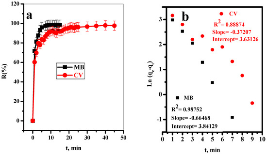 The effect of contact time on the removal efficiency (%R) of MB and CV-dyes using BC treated with 1.0% NaOH aqueous solution (T-BC-1) from aqueous solution was presented in Figure 3a. It was observed that the adsorption percentages of both MB and CV-dyes increased rapidly in the first 15 min. This is may be due to the unique layered structure of the prepared T-BC, which will make a large number of surface-active sites of the adsorbent available for effective adsorption. After that, equilibrium was reached for both two dyes where the active sites of the adsorbent were fully occupied [48,49].