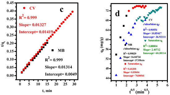 The parameters obtained from the slope and intercept of the linear plots of pseudo-first-order, pseudo-second-order, and intra-particle diffusion models were calculated and represented in Figure 3b–d, respectively, and listed in Table 2. Based on the values obtained, the pseudo-second-order kinetic model was better suited to explaining the kinetics of MB and CV-dyes adsorption onto T-BC-sheets. The rate-limiting step could be chemical adsorption, where the adsorption capacities are proportional to the number of active sites occupied on the T-BC-surface [50], and the calculated values of qe are 76.1035 and 75.3579 mgg−1 for MB and CV-dyes, respectively. These calculated values are closer to the experimental values of qe exp, which are equal to 73.55 and 68.8008 mgg−1 for MB and CV-dyes, respectively. Furthermore, depending on the greater R2 of intra-particle diffusion, it was concluded that the intra-particle diffusion plays a considerable role in the adsorption of MB and CV species by T-BC. Nano-sheet diffusion and sorption into the interior are the two processes in the intra-particle diffusion process. The active centers on the surface of the modified biochar were approximately filled after 15 min for MB and 45 min for CV.