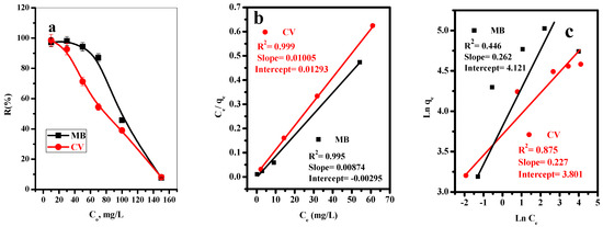(a) Effect of initial dye concentration on adsorption percent of MB and CV, (b) Langmuir isotherm model, and (c) Freundlich isotherm model (t = 8 min for MB and 10 min for CV, [dye] = 10, 30, 50, 70, 100, 150 mg/L, dose = 20 mg, pH = 7, T = 25 °C).