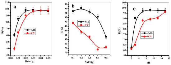 Effect of (a) adsorbent dose (t = 8 min for MB and 10 min for CV, [dye] = 30 mg/L, dose = 5, 10, 20, 30, 40, 50 mg, pH = 7, T = 25 °C), (b) NaCl dose (t = 8 min for MB and 10 min for CV, (dye) = 30 mg/L, dose = 20 mg, pH = 7, T = 25 °C, NaCL = 100–500 mg), and (c) pH on the removal percent of MB and CV-dyes from aqueous solution onto T-BC (t = 8 min for MB and 10 min for CV, (dye) = 30 mg/L, dose = 20 mg, pH = 2–11, T = 25 °C).