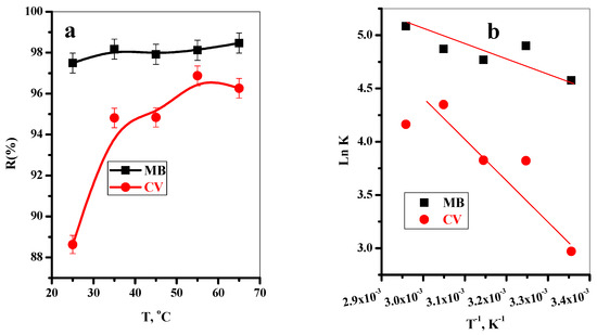 The impact of dye solution temperature in the range (25–65 °C) on the adsorption efficiency of MB and CV-dyes onto T-BC adsorbent was investigated, as shown in Figure 6a. The removal of MB-dye was slightly induced with the temperature, whereas the removal of CV-dye highly improved with an increase in the solution temperature. This may be described as follows: the dye solution temperature increases and the motion of the dye species increases, the collision between the dye species and adsorption sites increases, and the adsorption efficiency increases. Additionally, this could be due to a temperature-induced enhancement in porosity and total pore volume of the adsorbents [44,56].