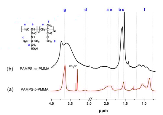 (a) 1H-NMR spectrum of PAMPS-b-PMMA in CD3OD and (b) PAMPS-co-PMMA in DMF-d7. Molar composition [AMPS]o/[MMA]o = 1/2.
