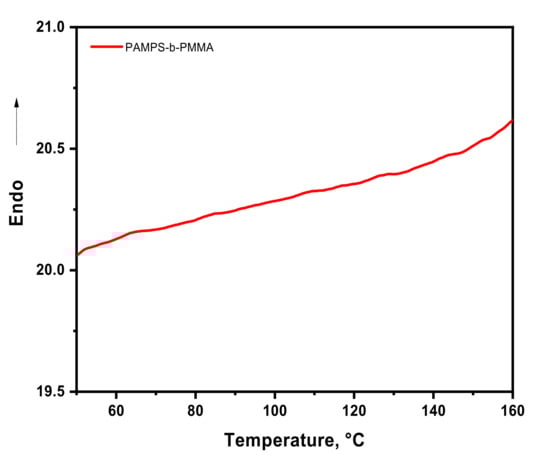 Two different glass transition temperatures (Tg), associated with individual polymer PAMPS (124 °C) and PMMA (114 °C) blocks, were expected to be observed in the DSC curves, due to their inherent immiscibility [33,34]. However, as can be seen in Figure 2, no clear Tg was presented by the PAMPS-b-PMMA copolymers, which may be due to the large number of water molecules bound to the copolymer chains [34,35], the presence of chain interactions or crosslinking between the different functional groups, [28] and/or the close values of their Tgs.