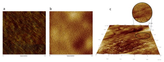 The immiscibility of the amphiphilic block copolymers leads to microphase separation, where well-defined nanostructures can be obtained under the appropriate conditions [36,37]. In this context, the resultant morphologies of the block copolymer membrane (with 24% PAMPS and roughly 90 µm membrane thickness) were investigated after a prolonged or fast annealing step on silicon surfaces. Figure 3 shows the tapping-mode AFM images of PAMPS-b-PMMA-1:1 (24/76 mol%) when thermally annealed under vacuum at 120 °C for 72 h (Figure 3a) and when annealed using a microwave reactor for 180 s at 120 °C in a toluene environment (Figure 3b,c), as reported by B. Xiaojiang et al. [37].