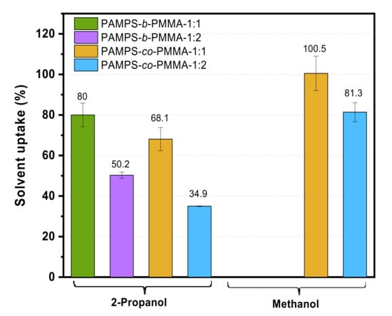 The 2-propanol and methanol uptake of membranes made from PAMPS-b-PMMA and PAMPS-co-PMMA copolymers at different PAMPS concentrations.