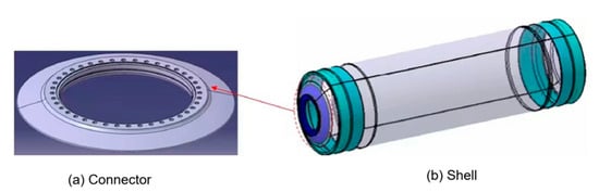Since the connector was fixed on the case using bolts, the primary RS05A metal connector was designed with M28 × 1.5 threaded hole in the middle. The bushing made of AL-7075-T6 was embedded in the composite connector to solve the problem of the composite being difficult to use as the metal connector.